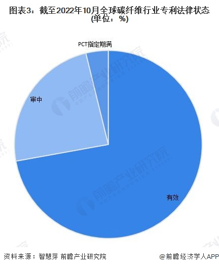 目前,全球碳纤维行业大多数专利处于“有效”状态,占全球碳纤维专利总量比例超过70%;处于“审中”状态的专利占比超过20%;处于“PCT指定期满”状态的专利占比在4%左右。