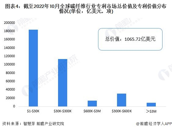 截至2022年10月,全球碳纤维行业专利总价值为1065.72亿美元。其中,3万美元以下的碳纤维专利申请数量最多,为183498项;其次是3万-30万美元的碳纤维专利,合计专利申请量为113169项。3百万美元以上的碳纤维专利申请数量最少,为8943项。