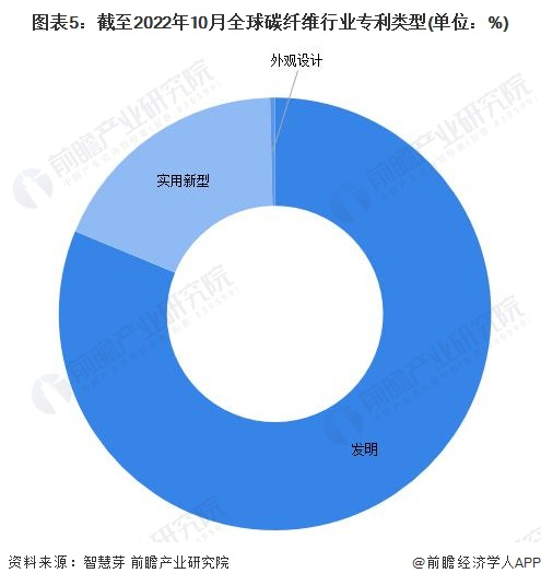 在专利类型方面,目前全球有约30万项碳纤维发明专利,占全球碳纤维专利申请比重最大,超过80%。实用新型碳纤维专利和外观设计型碳纤维专利数量占比分别为18.40%和0.36%。