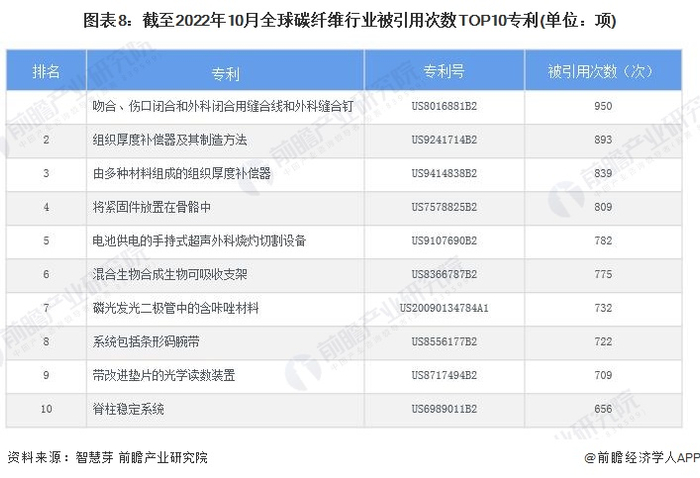 吻合、伤口闭合和外科闭合用缝合线和外科缝合钉(专利号:US8016881B2)和组织厚度补偿器及其制造方法(专利号:US9241714B2)是被引用次数最多的两大碳纤维专利,其中第一大专利被引用的次数超过了900次。其他被引用次数前十大专利如下所示: