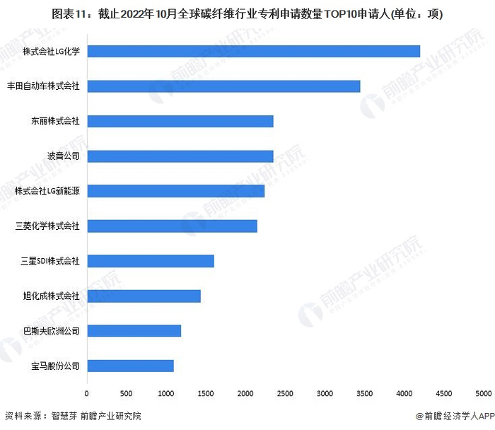全球碳纤维行业专利申请数量TOP10申请人分别是株式会社LG化学、丰田自动车株式会社、东丽株式会社、波音公司、株式会社LG新能源、三菱化学株式会社、三星SDI株式会社、旭化成株式会社、巴斯夫欧洲公司和宝马股份公司。