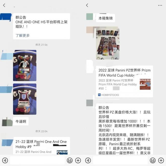 在一个500人的微信群中,商家发出了一条类似互联网“黑话”的群公告。公告中的“PZ”是卡牌公司panini(帕尼尼)新发售的世界杯球星卡prizm系列,球星卡在不同的地区有着不同的设计,美盘对应着美版的意思,上车则是组队拆卡的意思。
