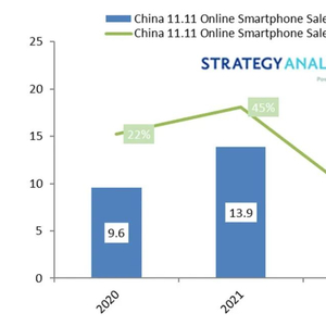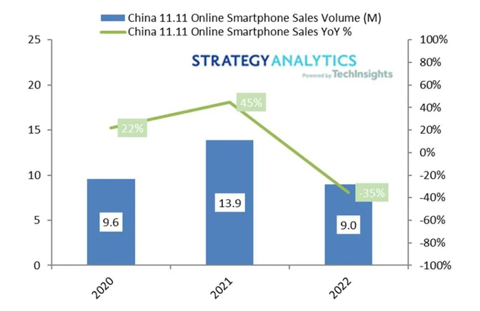 Strategy Analytics分析师彭鹏(Peng Peng)表示:“受新冠疫情、消费者消费疲软和经济逆风的影响,今年中国双十一智能手机销量表现平平。我们估计,今年双十一网购节期间智能手机销量为900万部,同比下降35%。受更高价苹果iPhone的推动,智能手机线上零售价格增长至4,089元(580美元),同比增长10%,但智能手机线上销售总营收仍同比下降29%,为368亿元(52亿美元)。”