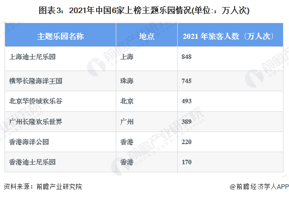 2021年中国有6家主题乐园上榜全球25强,其中上海迪士尼乐园和横琴长隆海洋王国挤进全球前十,2021年旅客人数分别为848万人次和745万人次。