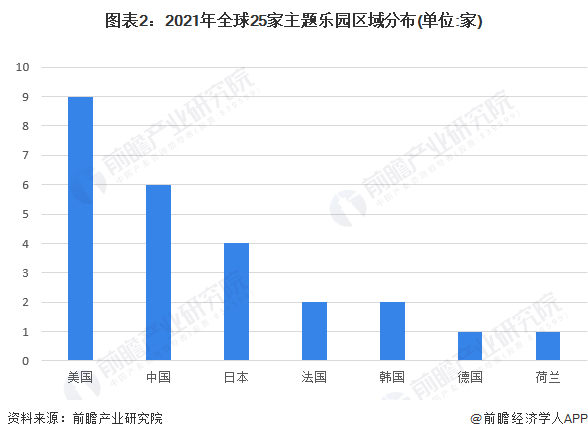 2021年上榜的全球25家主题乐园中,美国的主体乐园上榜最多,共有9家,其中6家位于佛罗里达州,3家位于加利福尼亚州。中国有6家主题乐园上榜,日本有4家。