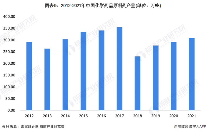 从化学药品原药产量来看,我国化学原料药产业曾经历了长期快速发展阶段,产量规模一度上升至超过350万吨,导致国内现阶段传统大宗原料药产能过剩,2018年开始,国内传统大宗原料药产量开始下降,2018年国内原料药总产量降至230.37万吨。2020年和2021年受疫情影响,国内原料药供给产量有所回升,2021产量再次突破300万吨,同比增长超过5%。