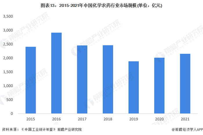 注:①2017-2018年未单独公布化学农药制造的收入情况,数据根据化学农药占化学原料和化学制品收入的比例(约30%)测算得出;②《中国工业统计年鉴》中统计的化学农药规模统计范围指化学农药原药,以及经过机械粉碎、混合或稀释制成粉状、乳状和水状的化学农药制剂的生产活动,年鉴中营业收入的统计范围指企业从事销售商品、提供劳务和让渡资产使用权等生产经营活动形成的经济利益流入;③由于《中国工业统计年鉴2021》公布的2020年数据,《中国工业统计年鉴2022》暂未发布,2021年数据也是根据比例测算得出。