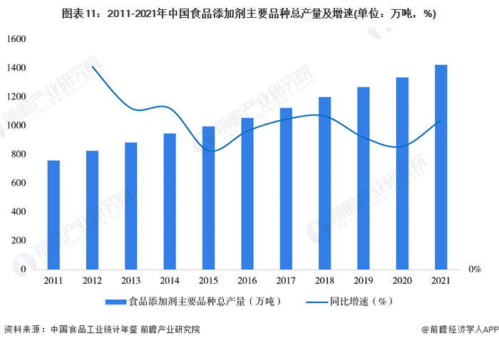 注:年鉴统计食品添加剂主要品种产量为甜味剂、着色剂、食用香精香料、防腐剂和抗氧化剂、增稠剂、乳化剂和品质改良剂产量总和