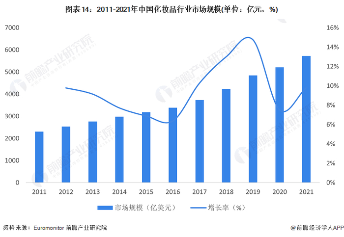 伴随我国经济的不断发展,居民收入水平的不断提高,日化行业的规模不断提升。以化妆品为例,在欧美及日韩大牌化妆品公司对中国市场的开拓下,国内消费者的化妆品消费理念逐步增强,国内化妆品市场规模迅速扩大。据Euromonitor统计数据,2011-2021年我国化妆品的市场规模呈现逐年递增的趋势,但2011-2019年市场规模增长率呈现先下降后上升趋势。我国市场规模从2011年的2309.44亿元增长到了2021年的5726.14亿元,复合增长率约为9.51%。