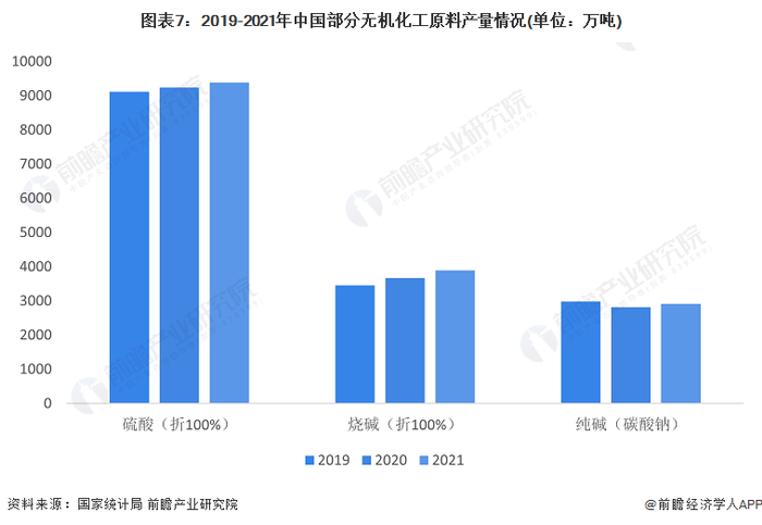 无机化工原料种类繁多中,以硫酸、烧碱、纯碱为例,可以看出三种代表型无机化工原料2021年的产量均较2020年有所上升,原料市场供应稳定。