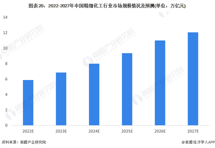 根据Marketupdate发布的《2021全球精细化工品市场报告》,Marketupdate预测全球精细化学品市场将以相当大的速度增长。亚太地区将在未来几年占据更多的市场份额,特别是在中国地区,预计未来行业年复合增长率将超过全球精化行业年复合增长率。结合中国化工协会2019年对于精细化工行业2021年总产值的预测,初步预测2022-2027年中国精细化工行业市场规模逐年上升,2027年市场规模有望超过11万亿元。
