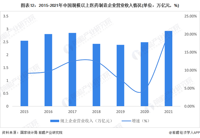 目前中国已成为全球化学原料药的生产和出口大国之一,还是全球最大的药物制剂生产国,同时,也成为世界疫苗产品的最大生产国,国产疫苗在满足国内居民防病、治病的同时,已开始向世界卫生组织提供疫苗产品,用于其他国家的疾病预防。2015-2020年我国规模以上医药制造业营业收入持续增加,2020年达到了2.49万亿元,同比上升4.5%。2021年,我国规模以上医药制造企业营业收入规模达到2.93万亿元,同比增长20.1%。整体来看,医药行业需求市场上升,未来发展潜力较大。