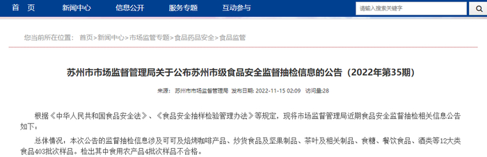 中国质量新闻网讯 近日,苏州市市场监督管理局公布苏州市级食品安全监督抽检信息(2022年第35期),涉及12大类食品403批次样品。其中,抽检酒类80批次,全部合格。