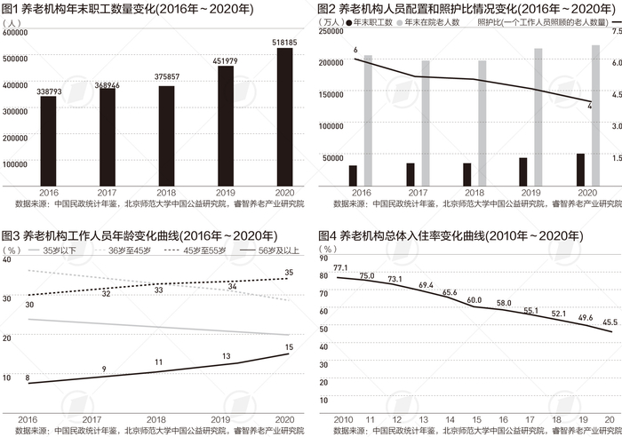 从人员配置上来看,这十年,养老机构照护比(一个工作人员照顾的老人数量)提高:从2016年的平均6位老人配备一名工作人员转变为2020年的平均4位老人配备一名工作人员。