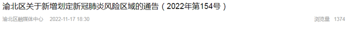 重庆市渝北区新型冠状病毒肺炎疫情防控工作指挥部关于新增划定新冠肺炎风险区域的通告(2022年第154号)。