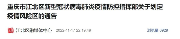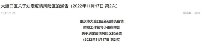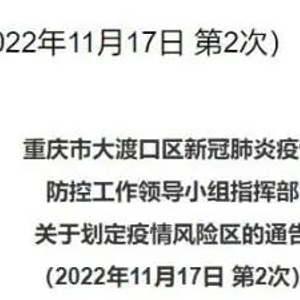重庆市大渡口区新冠肺炎疫情防控工作领导小组指挥部发布关于划定疫情风险区的通告(2022年11月17日第2次)。