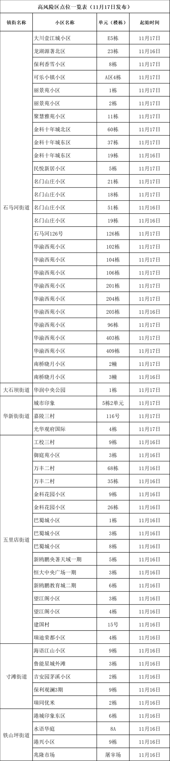 11月15日起算:花园路街道华竹花园2期、中富大厦B栋、骑龙山庄闲庭居5栋、大石桥22栋1单元、仪表厂5栋一单元;南坪街道温馨南苑、万达钰邸、南坪新街金明大厦、福红路40号2单元、万寿花园98栋2单元、山河大厦、商业大楼、南坪东路87号1单元、惠工大厦、万达铭邸1栋;南坪镇骏逸江南6B、骏逸江南7B、江南国际新城6栋、巨成龙湾物管办公室;天文街道鲁能领秀城3街区167-3;铜元局街道上海城小区23栋、长江新村2栋1单元、彩虹道小区2栋;涂山镇莲花村花果2组66号、文韵江南对面老房子、国际社区观园一期8栋;迎龙镇银河路10号;长生桥镇琥珀居3栋1单元、金科中央御园二期38栋、金科世界城洋房20栋、江南水岸7组团7栋、同景国际城香溪迈上5栋;弹子石街道星期玖商务宾馆、弹一村药厂小区105号;海棠溪街道海棠晓月C区4栋。