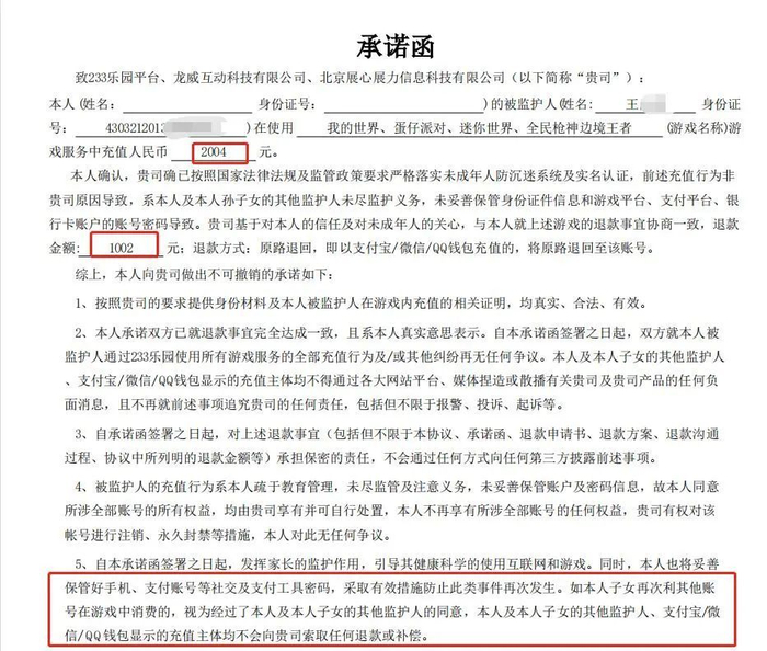 《承诺函》中写道,小杰在“在使用我的世界、蛋仔派对、迷你世界、全民枪神边境王者 (游戏名称)游戏服务中充值人民币 2004 元。”公司“已按照国家法律法规及监管政策要求严格落实未成年人防沉迷系统及实名认证,前述充值行为非公司原因导致,系本人及本人孙子女的其他监护人未尽监护义务,未妥善保管身份证件信息和游戏平台、支付平台、银行卡账户的账号密码导致。公司基于对本人的信任及对未成年人的关心,与本人就上述游戏的退款事宜协商一致,退款金额 1002 元。”