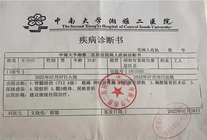 王先生今年34岁,是湘潭人。在今年5月份,他在贵州某隧道工地工作时,被工程车压到造成脊椎粉碎性骨折,入院诊断为截瘫,后来转回长沙进行治疗。