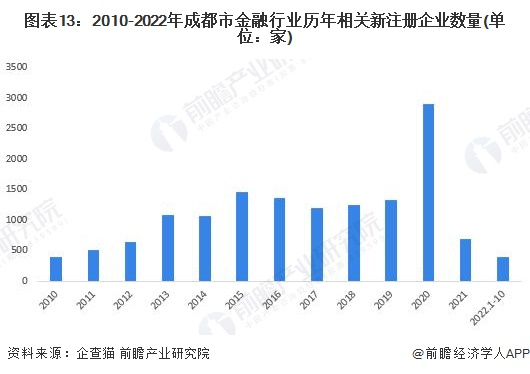 根据企查猫查询数据,截至2022年10月26日,成都金融行业相关的注册企业共18702家,其中2020年新注册企业数量创历史高峰,2020年全年成都金融行业注册企业数量为2894家,较2019年增加1567家;截至10月26日,成都2022年金融行业注册企业数量为391家。