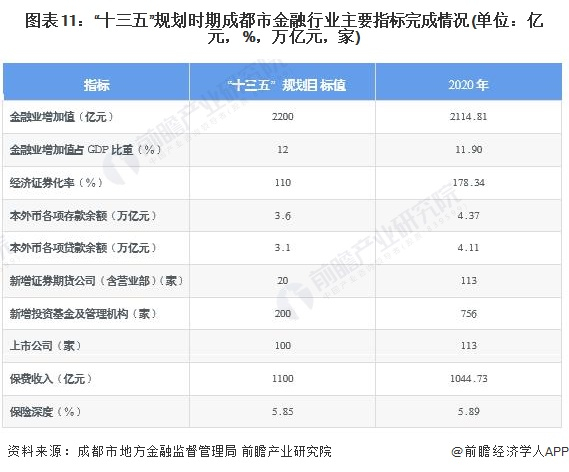 《成都市“十四五”金融业发展规划》提出,到“十四五”末期,成都市金融业增加值达2800亿元,金融业增加值占GDP比重达12%;金融机构本外币各项存款余额达6.5万亿元以上,本外币各项贷款余额达6.5万亿元;当年保费收入达1500亿元,保险深度达6%以上。