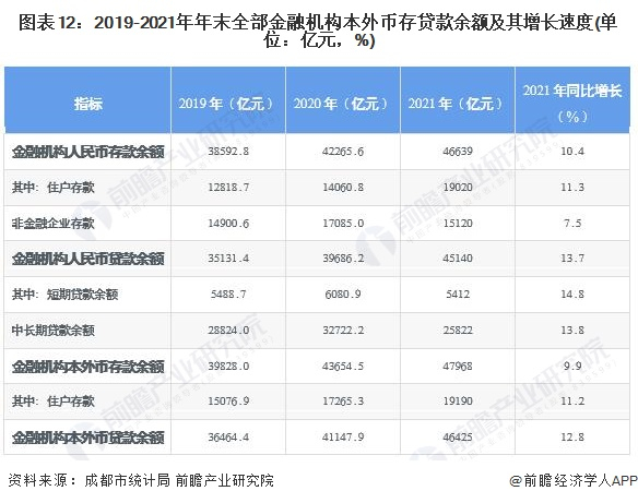 截至2021年末,成都市金融机构本外币存款余额47968亿元,比2020年末增长9.9%;金融机构本外币贷款余额46425亿元,比2020年末增长12.8%。
