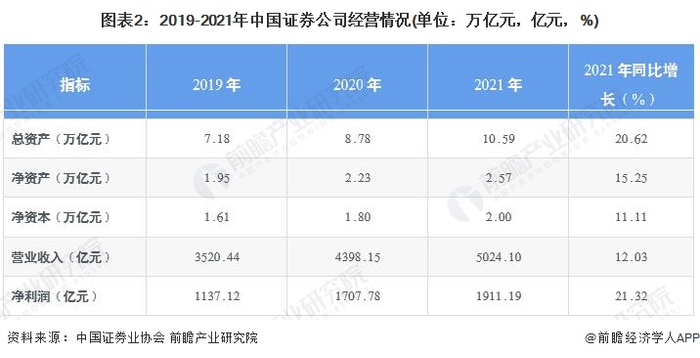 中国证券业协会数据显示,2021年中国证券公司总资产为10.59万亿元,净资产为2.57万亿元,净资本为2.00万亿元;证券公司2021年全年实现营业收入5024.10亿元,同比增长12.03%;实现净利润1911.19亿元,同比增长21.32%,净利润增速明显超过收入增速,盈利状况持续提升。