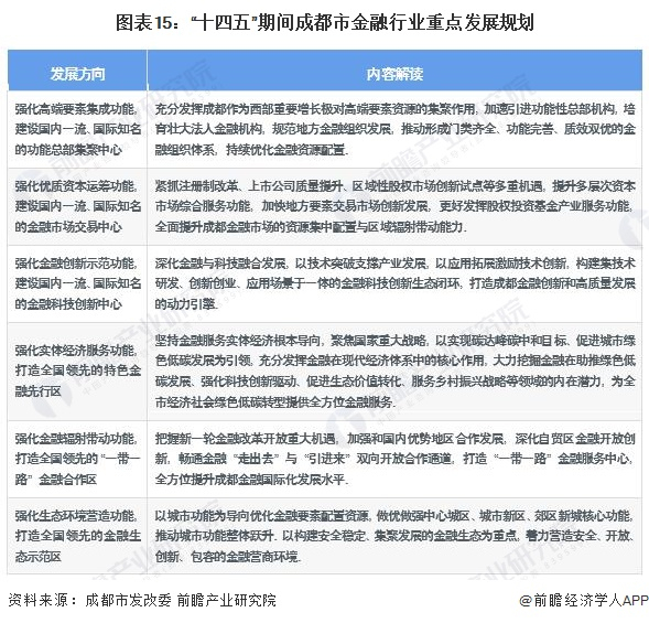 发展目标方面,《成都市“十四五”金融业发展规划》提出,“十四五”期间成都市将从强化高端要素集成功能,建设国内一流、国际知名的功能总部集聚中心、强化优质资本运筹功能,建设国内一流、国际知名的金融市场交易中心、强化金融创新示范功能,建设国内一流、国际知名的金融科技创新中心、强化实体经济服务功能,打造全国领先的特色金融先行区、强化金融辐射带动功能,打造全国领先的“一带一路”金融合作区和强化生态环境营造功能,打造全国领先的金融生态示范区,共六大方向,推动成都市金融产业健康稳定发展。