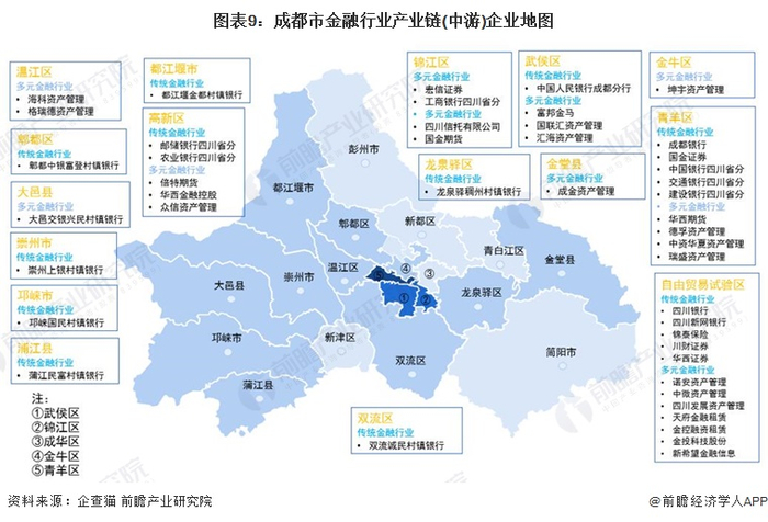 从金融行业中游代表性企业分布地图来看,目前成都市金融生产企业主要分布在以青羊区、武侯区和锦江区为主的成都市中心城区,以及高新区和自由贸易区。