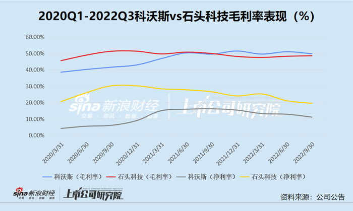 而在盈利能力方面,根据图中可以看出,近三年来,科沃斯与石头科技的毛利率表现情况较为一致,在40%-50%之间稳定浮动。2022年第三季度,科沃斯的毛利率为49.74%,石头科技的毛利率为48.52%。