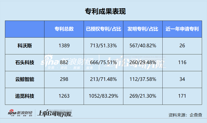 石头科技的各项指标排名在赛道中排在中间的位置,而发明专利的占比相对较少;