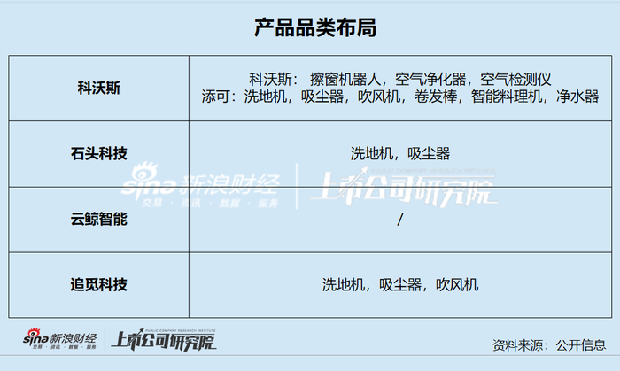 值得注意的是,大部分公司不甘心止步于扫地机器人产品,而是以“家居”、“清洁”为标签,纷纷扩充自身产品品类。