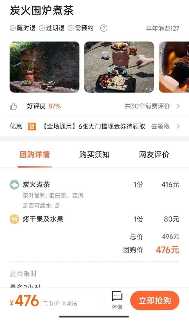 大众点评上,许多商家推出了“围炉煮茶”套餐。比如,北京雍和宫旁的一家茶室,推出了“炭火围炉煮茶”套餐,优惠后售价476元,半年消费100多次,包含一份炭火煮茶,和一份烤干果及水果。