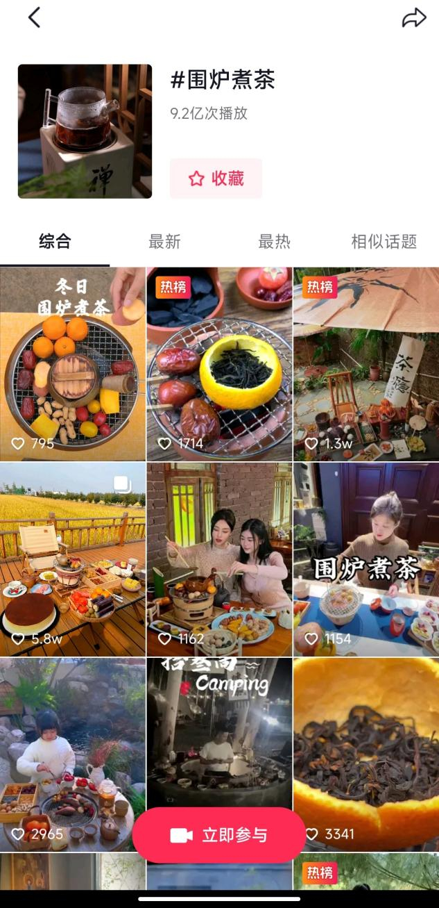 抖音上,话题“围炉煮茶”,已经拥有超过9亿次播放;快手上,“围炉煮茶”话题,拥有近2000个相关作品,累计播放近1500万次。