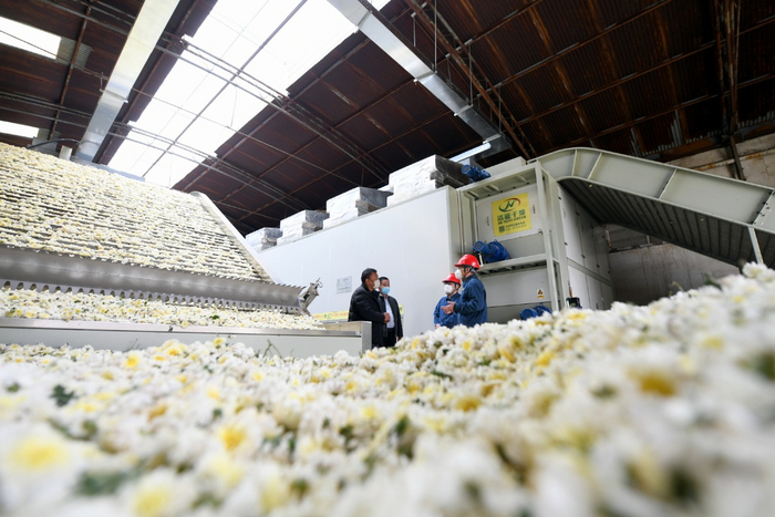 “怀菊花采摘加工最关键的就是时间,烘干脱水不及时,花瓣就会变红变黑,价钱能差一大半。今年,县委、县政府为我提供了70万元的专项补助资金,帮助选购安装了三台新型电烘干设备,和以前相比不仅更加环保节能,还提高了怀菊花烘干效率和成品品质,今年我的加工量整整提高了两倍。”在烘干车间,顾永胜看着新鲜出炉的怀菊花,喜悦之情溢于言表。