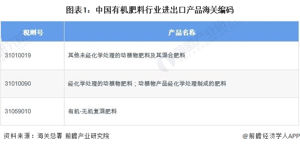 根据世界海关组织指定的《商品名称及编码协调制度的国际公约》,中国海关对有机肥料行业进出口贸的统计名称和HS编码为“31010019”(其他未经化学处理的动植物肥料及其混合肥料)、“31010090”(经化学处理的动植物肥料;动植物产品经化学处理制成的肥料)以及“31059010”(有机-无机复混肥料)。