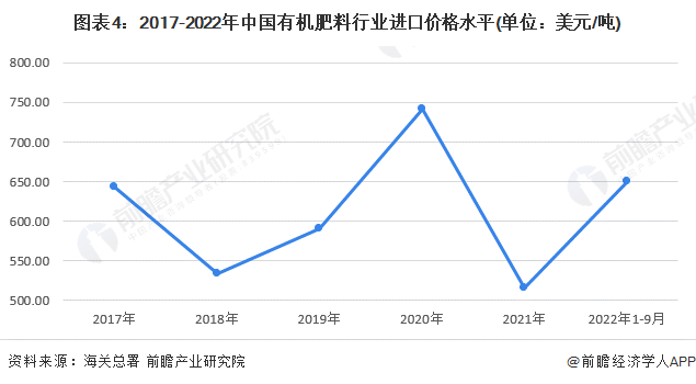 从我国有机肥料进口产品历年平均价格水平来看,行业总体呈现波动的态势,2020年进口均价达到最高值741.51美元/吨,2021年下降到了516.25美元/吨,2022年1-9月回涨到649.49美元/吨的水平。