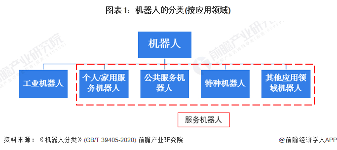 按机器人的应用领域进行分类,机器人可分为工业机器人、个人/家用服务机器人、公共服务机器人、特种机器人和其他应用领域机器人。根据《机器人与机器人装备词汇》(GB/T 12643-2013)的定义,服务机器人是指除工业自动化应用外,能为人类或设备完成有用任务的机器人。