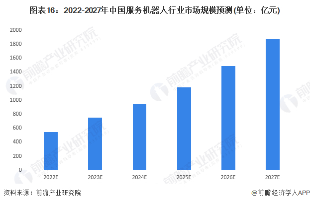 随着技术发展,服务机器人的应用需求增多,服务机器人市场逐渐打开,中国服务机器人即将进入市场启动期。新冠肺炎疫情催生“无接触”服务,服务机器人迎来重大发展机遇。受新冠肺炎疫情影响,预计到2023年市场规模将达到751.8亿元,到2027年中国服务机器人市场规模有望达到1872亿元。