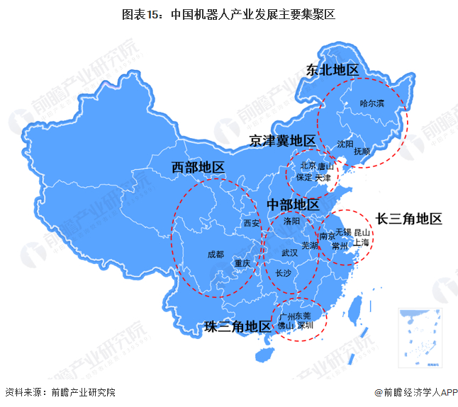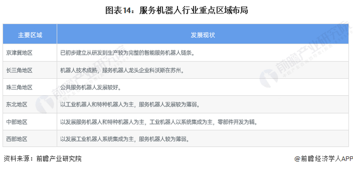 从各区域的重点布局来看,京津冀地区、长三角地区、珠三角地区和中部地区服务机器人行业发展相对较好,集中度也较高。