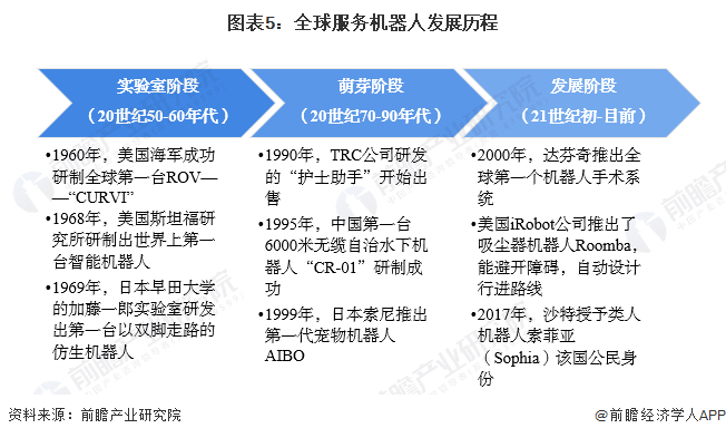 萌芽阶段(20世纪70-90年代):服务机器人具备初步感觉和协调能力,医用服务机器人、娱乐机器人等逐步投放市场。