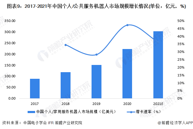 因此中国个人/公共服务机器人市场规模以较快增速不断扩大。2021年,中国个人/公共服务机器人市场规模约为302.60亿元。