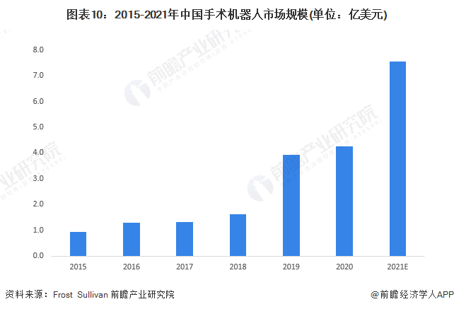 医疗服务机器人主要应用于手术领域,当下,中国手术机器人市场仍处于早期发展阶段,但增长潜力巨大;系由于中国的患者人数庞大且可能需要使用手术机器人进行的常规微创伤手术数量众多。根据Frost & Sullivan初步统计,2021年我国手术机器人市场规模约为7.6亿美元,其中腔镜手术机器人的市场规模从2015年的0.8亿美元上升至2021年的5.58亿美元。