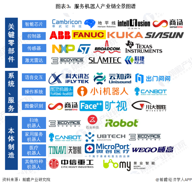 随着服务机器人行业的不断发展,目前市场上涌现了许多优秀的企业。ABB、KUKA等国外厂商则在控制器等零部件领域占据先发优势,国内企业在激光雷达传感器、AI芯片等新兴技术领域寻求突破,目前已取得阶段性成果,主要企业有沈阳新松、地平线、寒武纪等。在操作系统和软件服务上,国内企业在人工智能的技术浪潮中保持了国际领先地位。整机制造企业主要有康力优蓝、沈阳新松、优必选、科沃斯等。