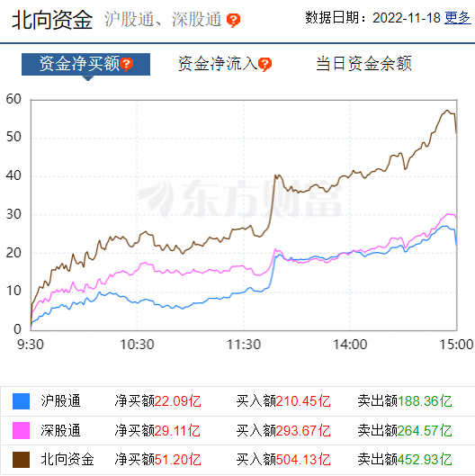 北向资金,今日合计净买入51.2亿元。其中,沪市净买入22.09亿元,深市净买入29.11亿元。