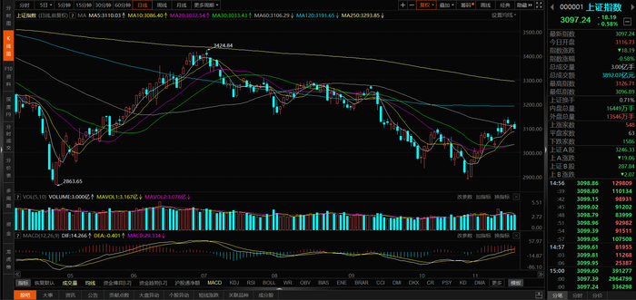 指数方面,集合竞价均小幅高开,早盘基本处于窄幅震荡状态,午后震荡走低。沪指收跌0.58%,创业板指收涨0.16%。两市成交额合计9787亿,较昨日增加近700亿。