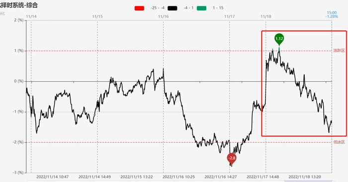 指标显示,市场短线情绪早盘快速冲入活跃区,主要受医药股影响,随后进入单边回落状态,主要受信创股影响,收盘在低迷区上方。