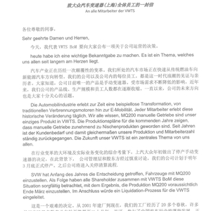 对此,大众汽车中国方面对财经汽车(ID:caijingqiche)表示网传信息属实,受市场需求变化带来的影响,大众汽车变速器(上海)计划于2023年3月正式停产,并开启公司关停清算流程。