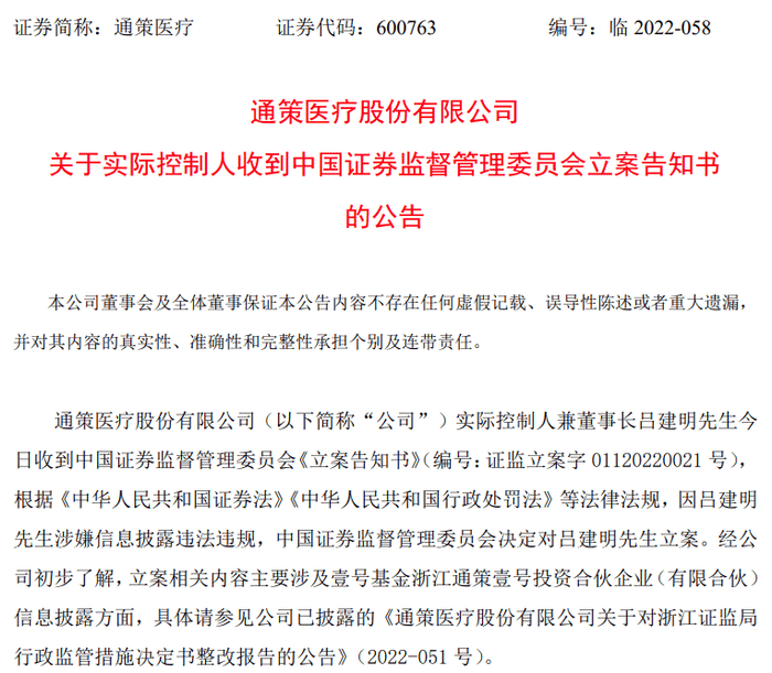 11月18日晚间,通策医疗公告称,吕建明因涉嫌信息披露违法违规而遭到证监会立案。
