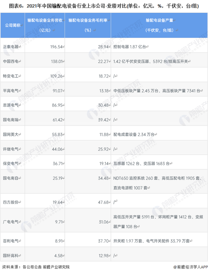 目前,我国输配电设备行业的龙头上市公司包括中国西电、平高电气、正泰电器等,以上上市公司的输配电设备业务营收均在90亿以上。2021年,四方股份、国电南瑞输配电设备业务毛利率水平较高,毛利率均在35%以上。